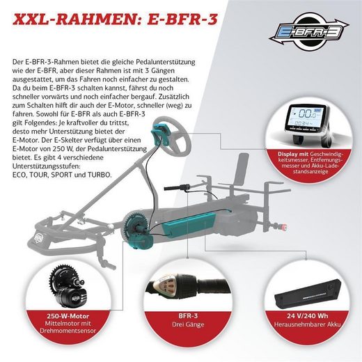 Der E-BFR-3-Rahmen bietet die gleiche Pedalunterstützung wie der E-BFR, aber dieser Rahmen ist mit 3 Gängen ausgestattet, um das Fahren noch einfacher zu gestalten. Da du beim E-BFR-3 schalten kannst, fährst du noch schneller vorwärts und noch einfacher bergauf. Zusätzlich zum Schalten hilft dir auch der E-Motor, schneller (weg) zu