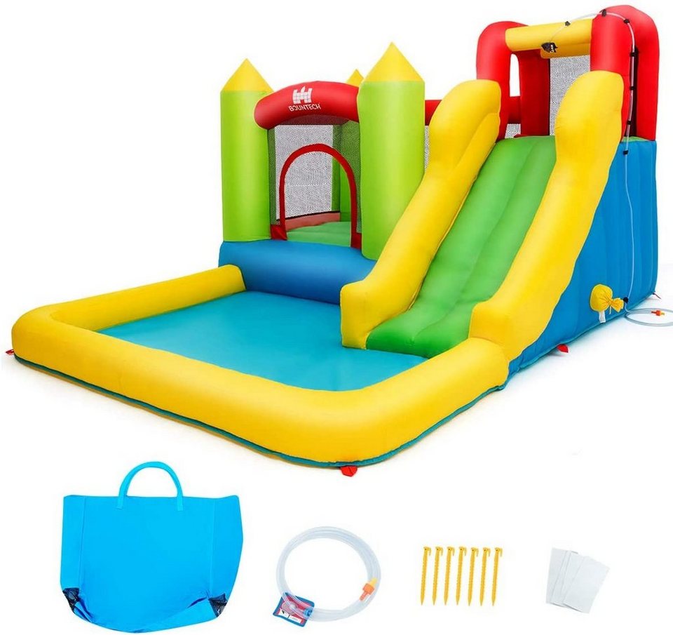 Dieser aufblasbare Wasser-Park ist ein perfektes Geschenk für Kinder, um sich ihre Freizeit zu vertreiben. Mit enthalten sind eine Rutsche, ein Planschbecken, eine Kletterwand und ein Hüpfbereich. So können Kinder nicht nur verschiedenste Vergnügungsaktivitäten erleben, sondern gleichzeitig auch ihre Balance trainieren. Die Netzwände um den Hüpfbereich herum gewährleisten die Sicherheit Ihrer Kinder und werden allen Anforderungen an eine gute Luftzirkulation gerecht. Dank des enthaltenen Wasserschlauchs kann die Hüpfburg als Wasser-Park genutzt werden, um die Kinder auch im wärmsten Sommer gut abkühlen zu können. Durch den zusätzlichen Transportbeutel und weiterer Zubehörteile kann die Hüpfburg überallhin mitgenommen werden. Zögern Sie nicht, diese Hüpfburg auszuprobieren!
