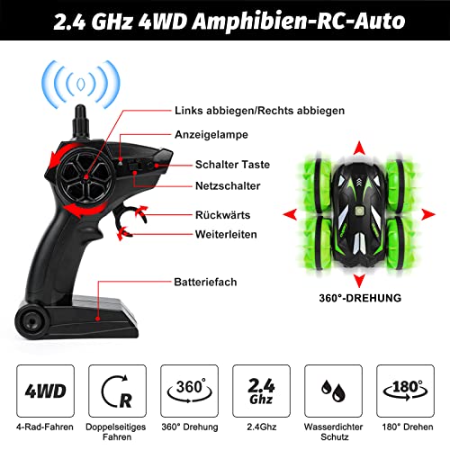 - ?【Amphibienfahrzeug Ferngesteuert】 Mit einer robusten ABS-Kunststoffkarosserie und Propeller-förmigen rutschfesten Reifen kann dieses Auto auf Terrain wie Sand, Hochebene, Grasland und Bergen gefahren werden und sogar im Wasser schwimmen. Mit diesem Auto ferngesteuert können Kinder leicht verschiedene Terrains erkunden!